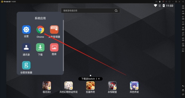 三、安装好后模拟器后,我们找到系统应用那个文件夹,找到Chrome浏览器或者浏览器,把游戏下载地址(gscq11.com)复制或者输入到浏览器搜索框,点击搜索,找到你想玩的游戏下载就可以了。